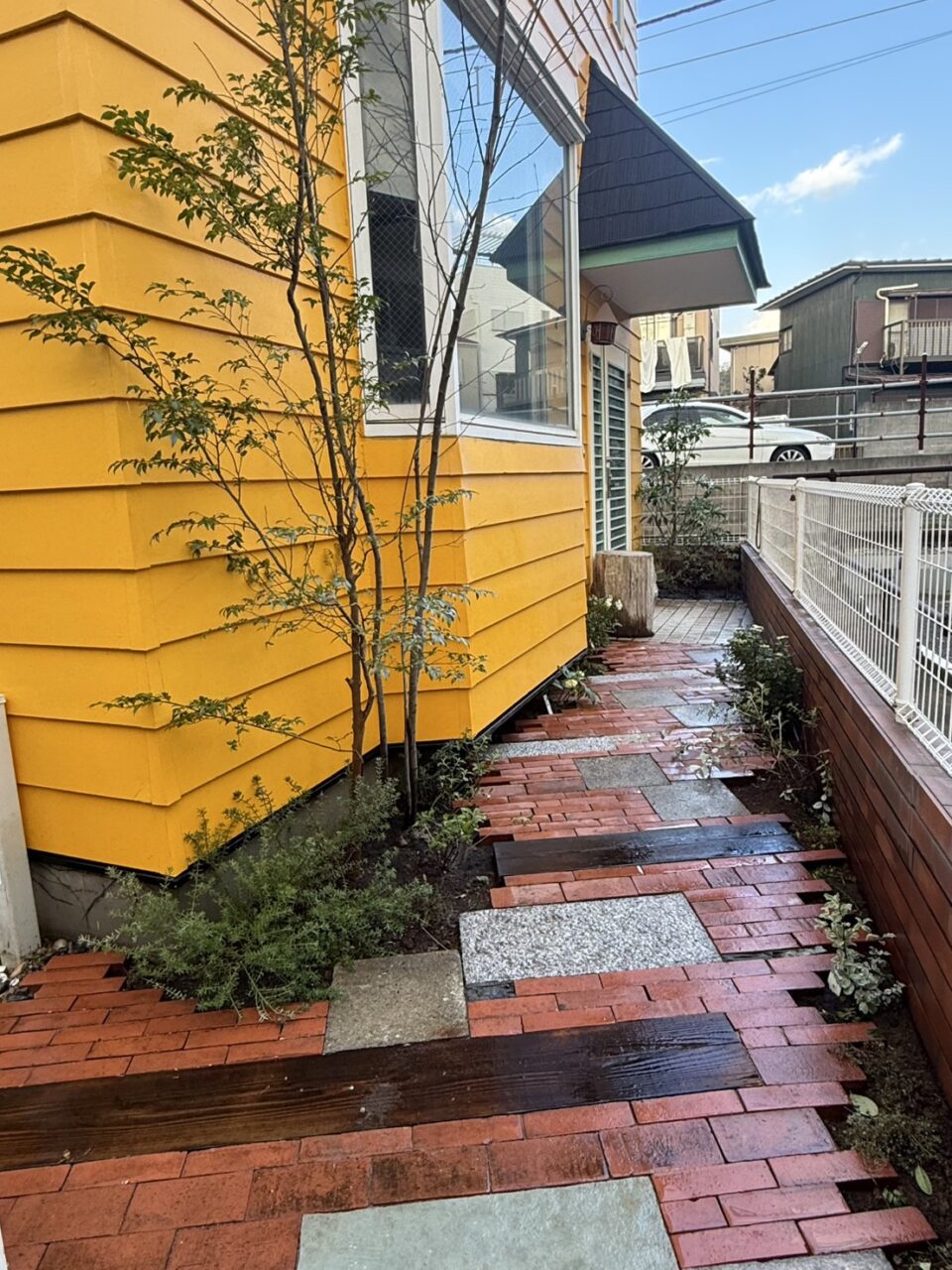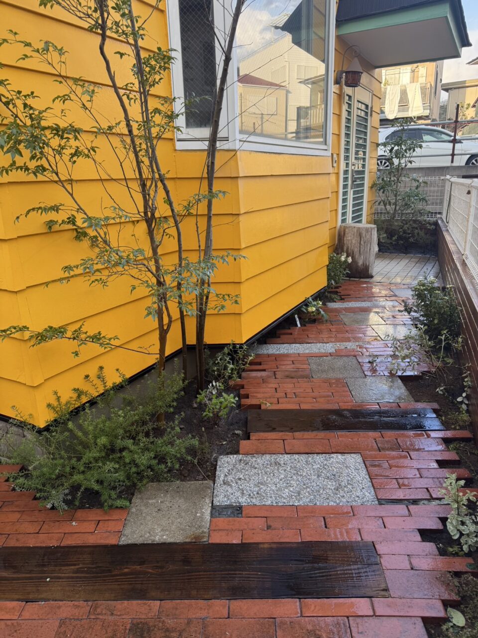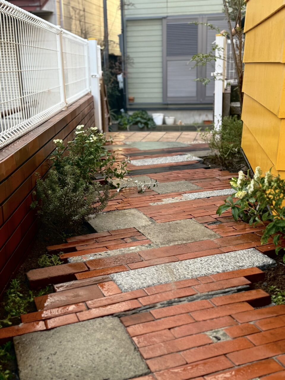 ただ戻すだけでなく、模様や色合いなどを意識し、見て楽しめてかつ使いやすい通路を心がけて施工しました。 レンガは木端立てして使用したり、そのまま使用したりしました。