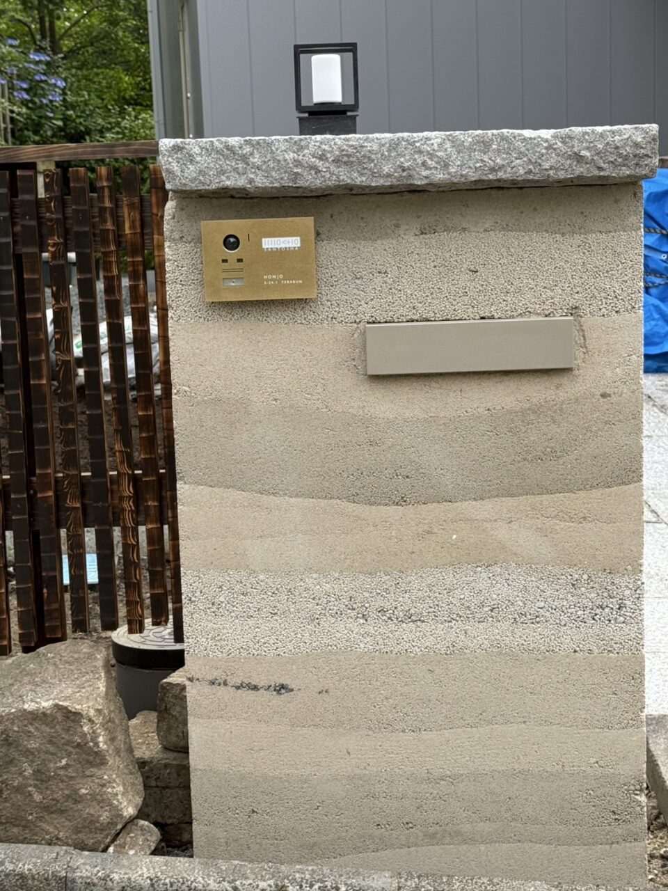版築の機能門柱と石積みのあるお庭を造りたいと、お施主様より弊社のホームページを見て、昨年ご連絡をいただきました。今年の5月から着工となり、完成いたしました。