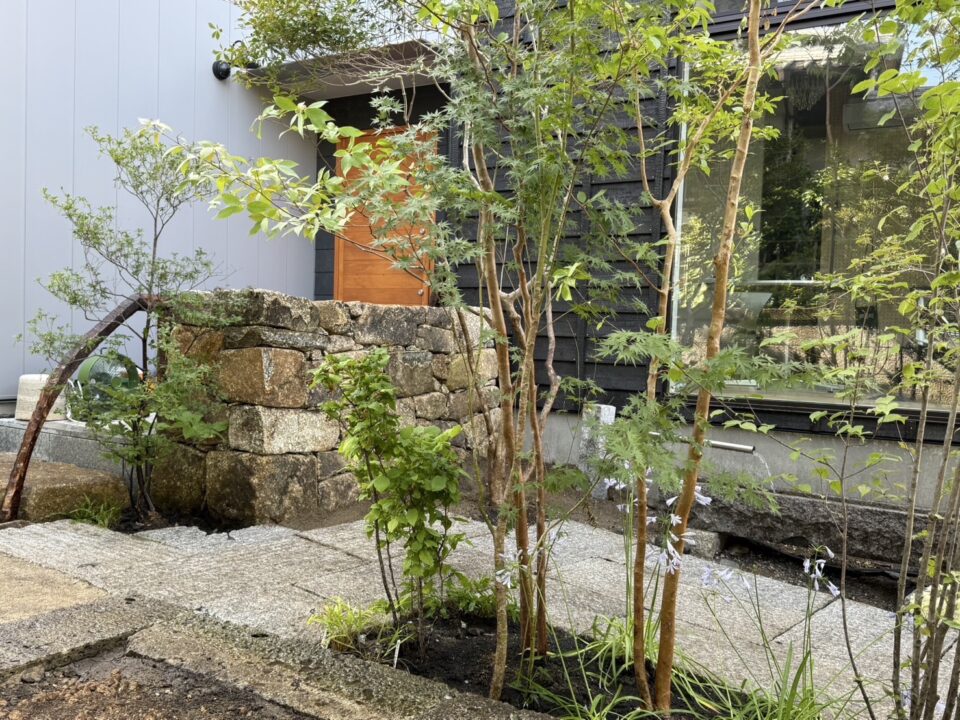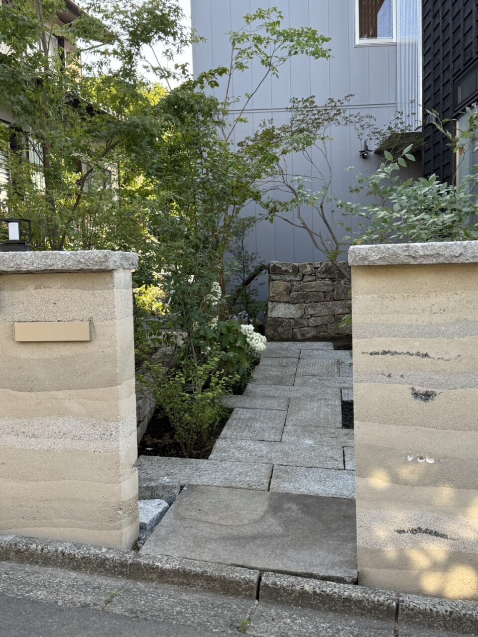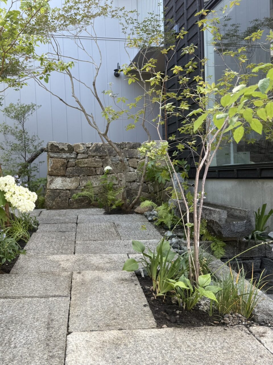 2対の機能門柱と、両面野面積みの石積みを施し、窓から見える景色も建築設計をお仕事とされているお施主様の気持ちが和むように植栽いたしました。