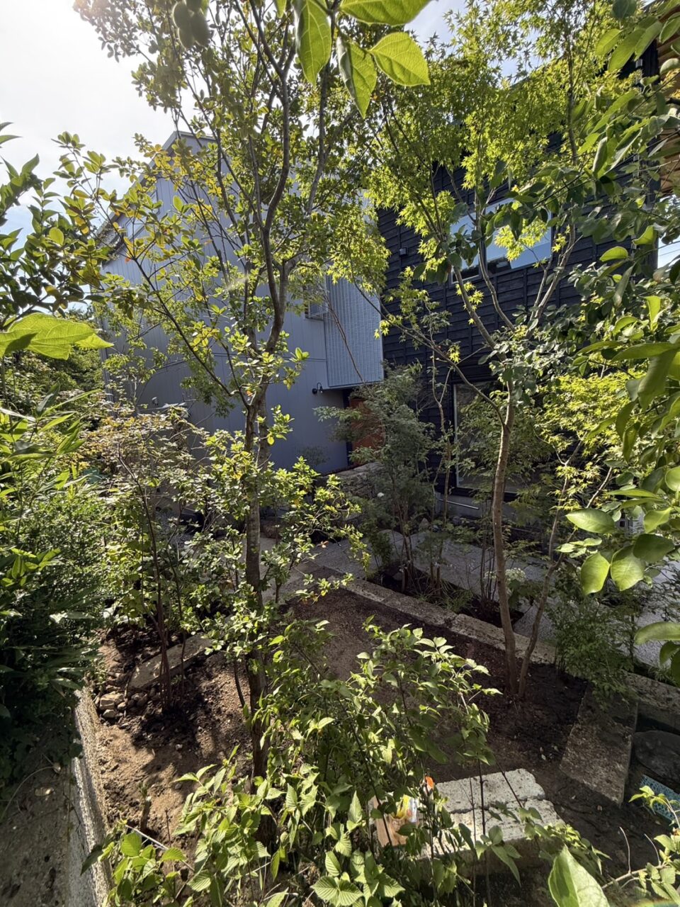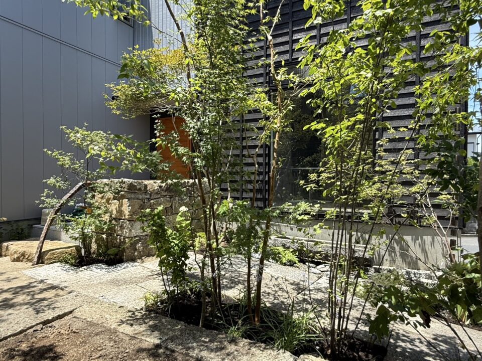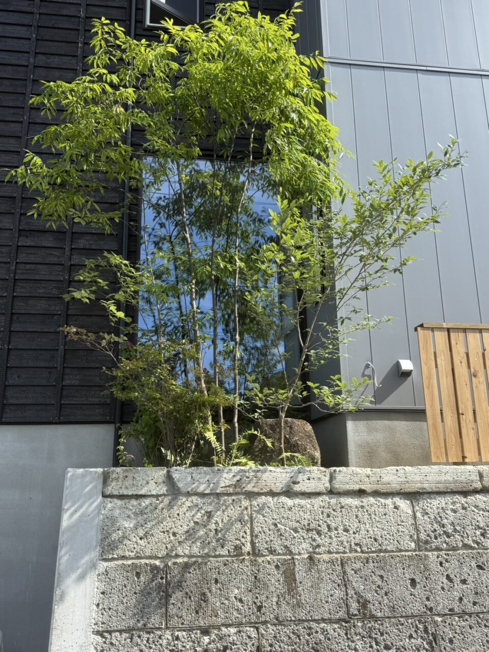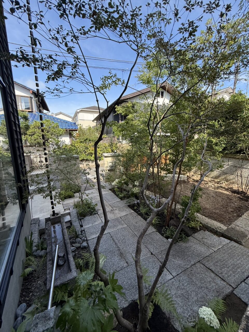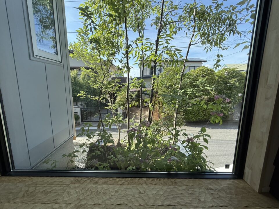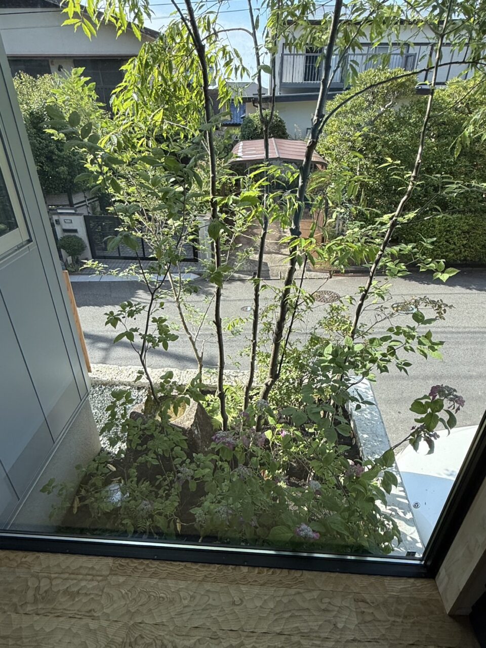 お施主様は建築設計をされている方です。神経を使い頭脳労働の合間に、窓から見える景色で少しでも癒していただきたいという思いを込めて意識して植栽させていただきました。