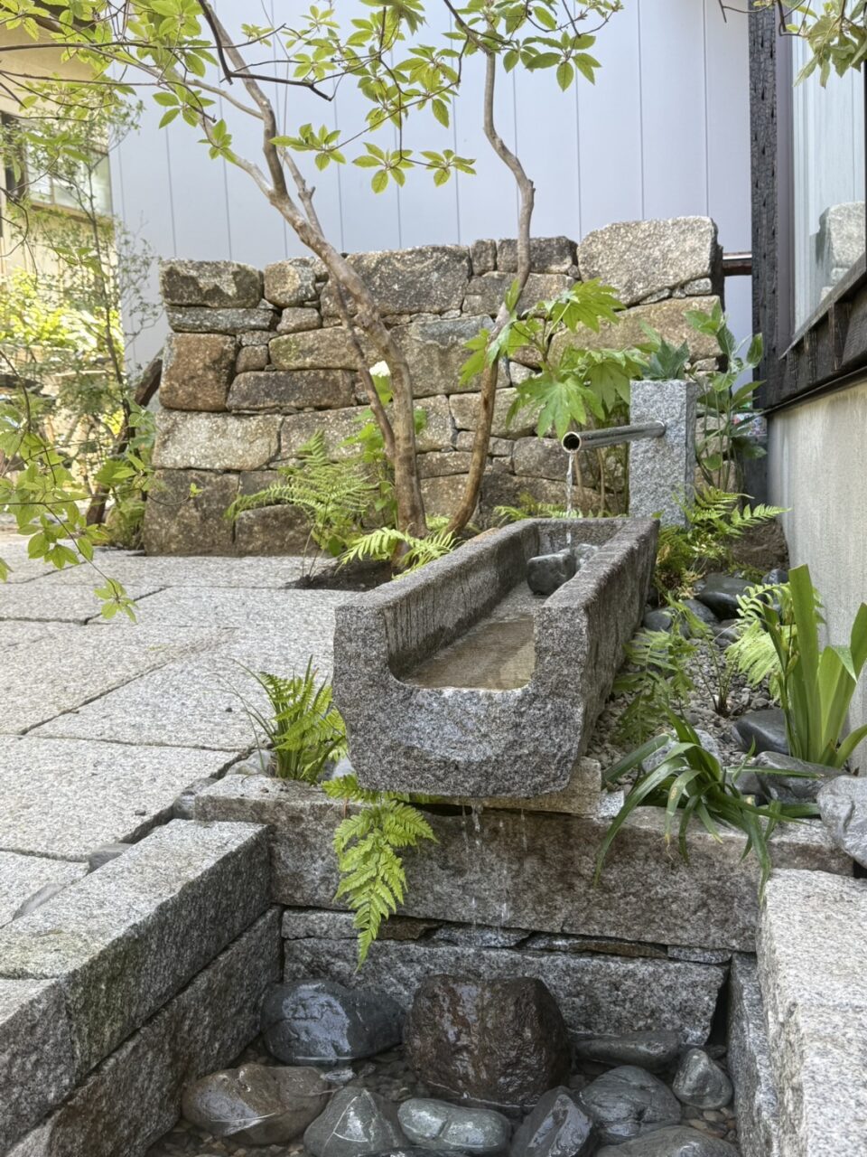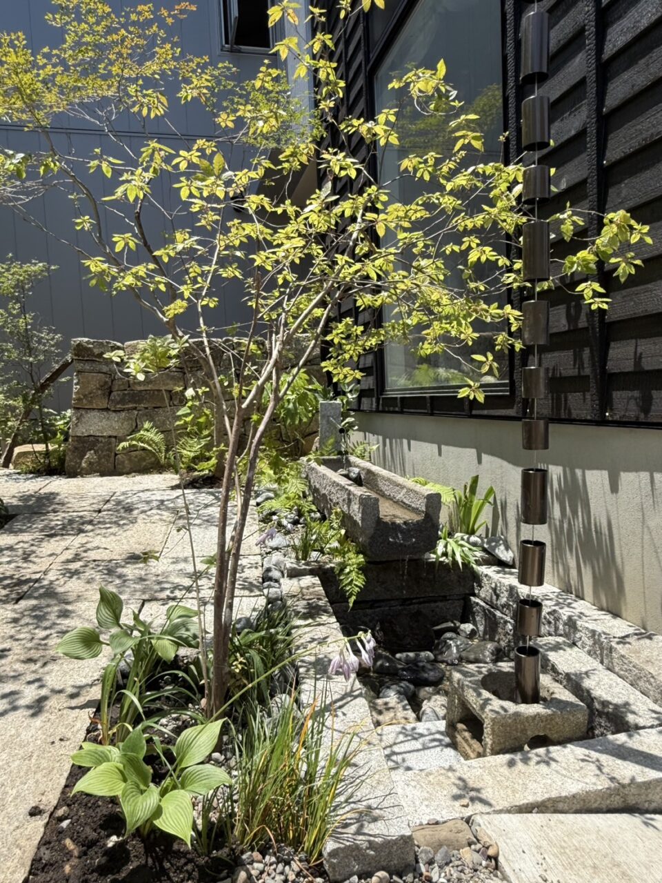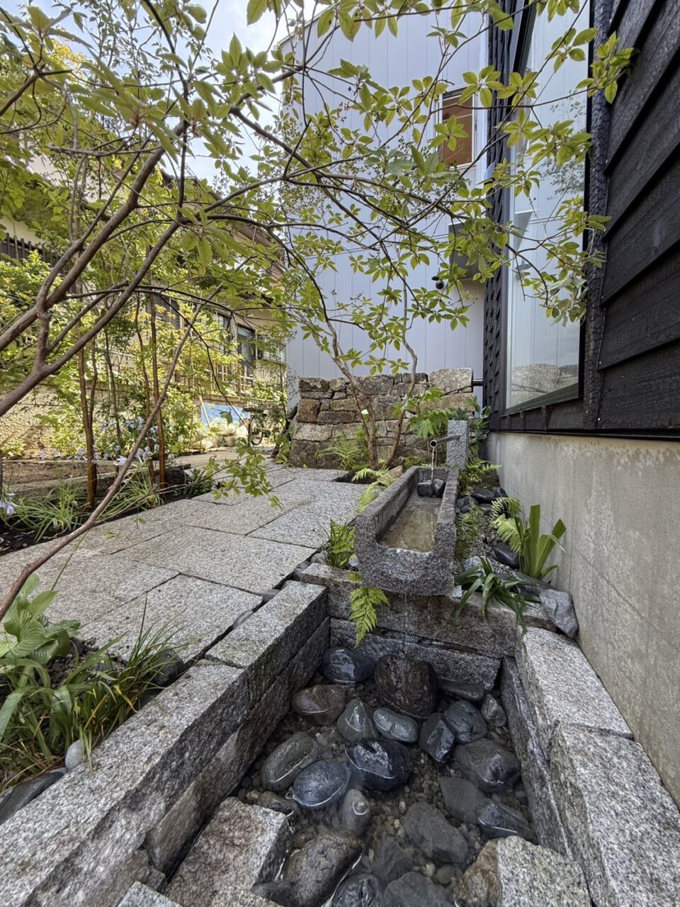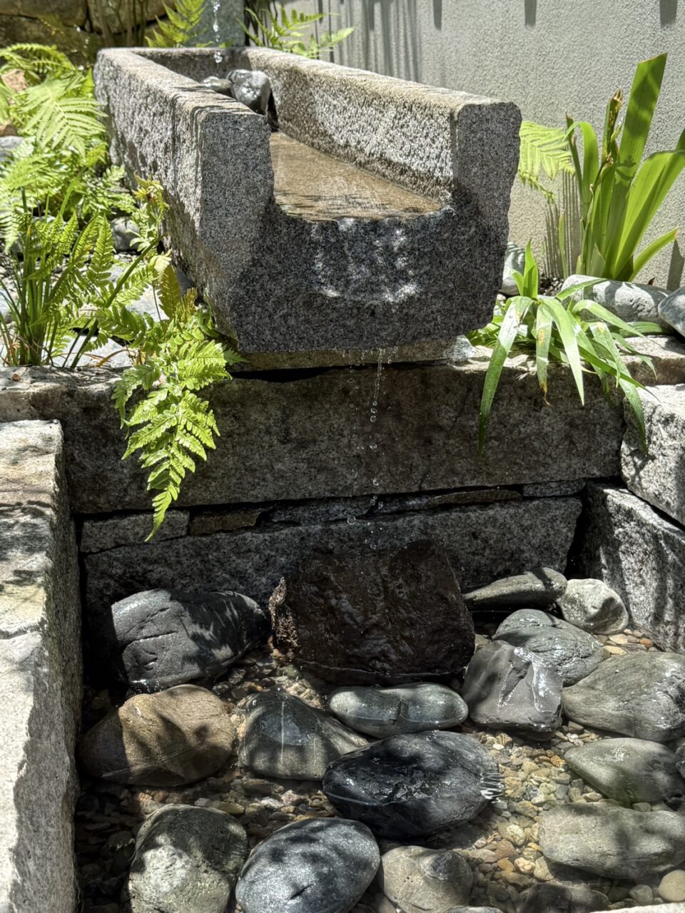 道路から玄関まで高低差があり、傾斜しているので、高低差を活かした水景にしました。循環式の水中ポンプを設置し、周りはアプローチの御影平板に合うように古材の御影石で積み上げました。