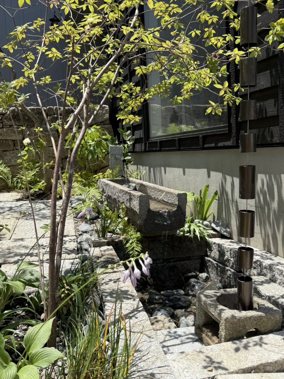 お施主様よりのご要望から、さらにこの空間に何が合い、調和のとれた造作ができるかを考えイメージを膨らませました。その結果水景と板塀が調和のとれた素敵な空間を醸し出せると思い、お施主様へご提案させていただき、ご快諾いただきました。