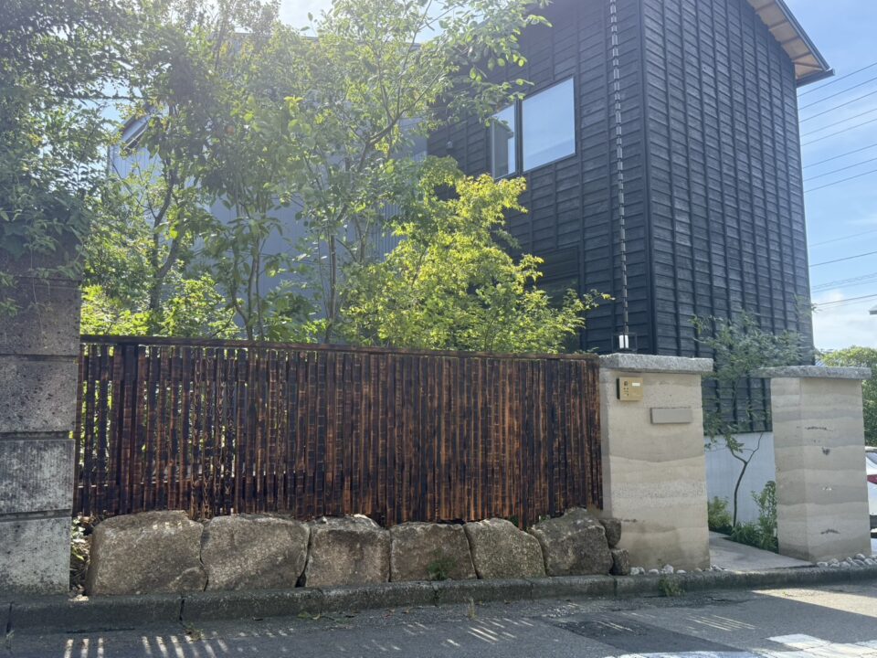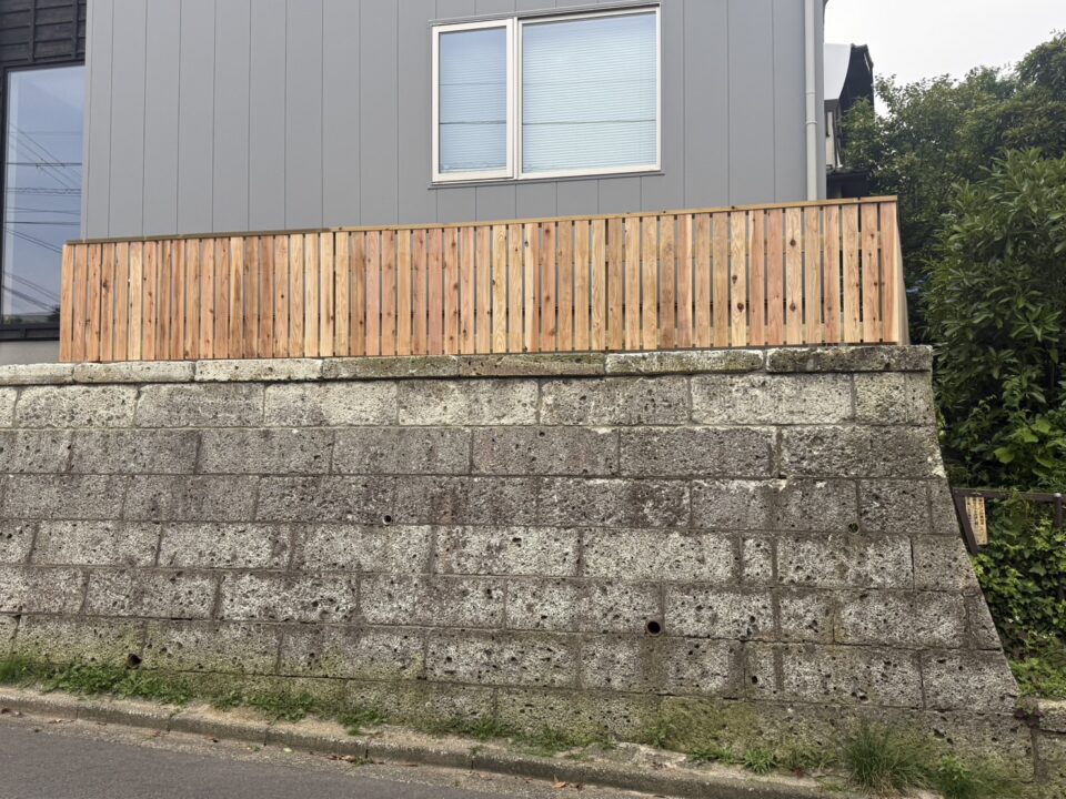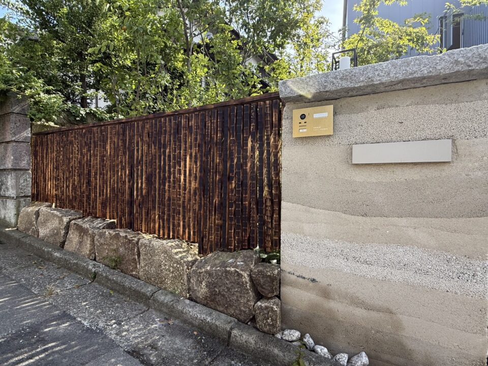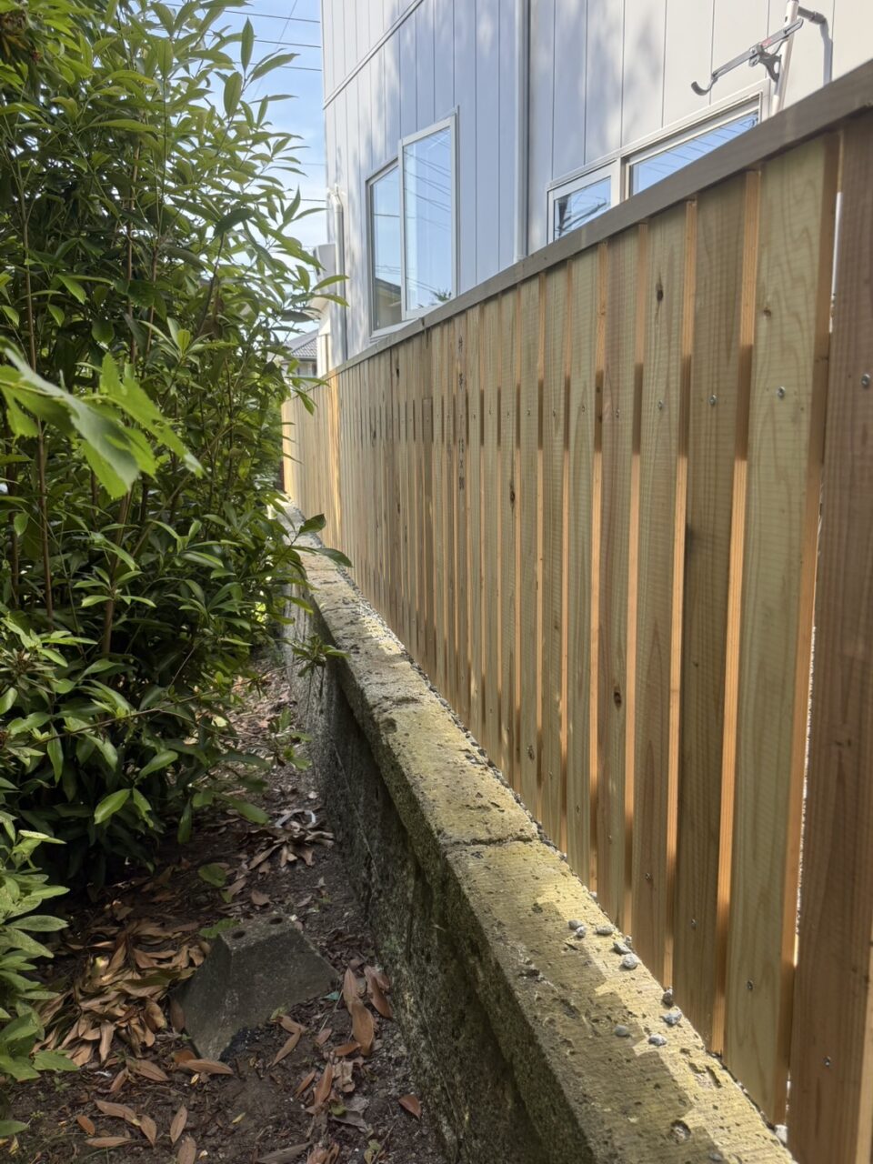 水景に続き、板塀も2種類造作いたしました。まずは、敷地裏側はシンプルに秋田杉の板を縦ばりにしました。