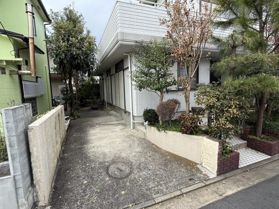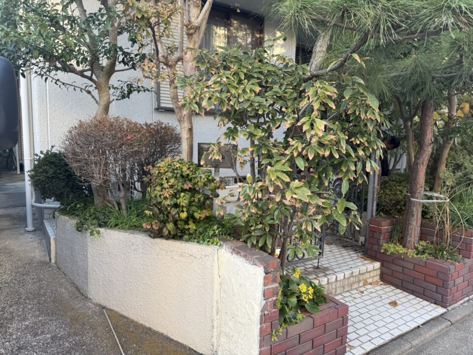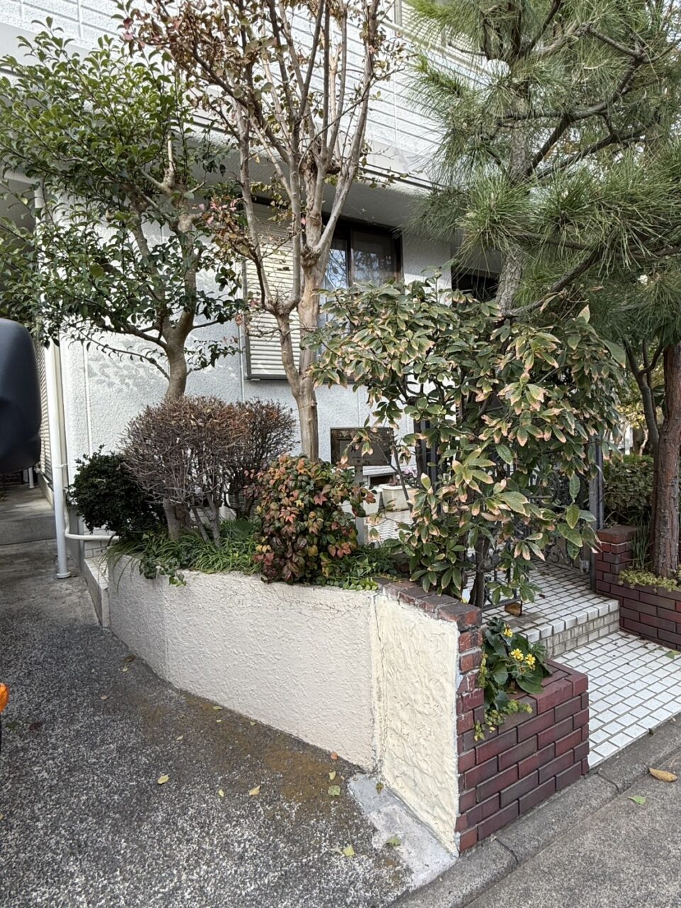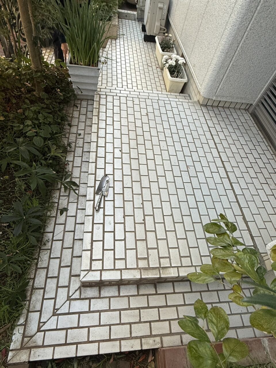 もともとは白いタイル張りの玄関アプローチと全面コンクリートでした。