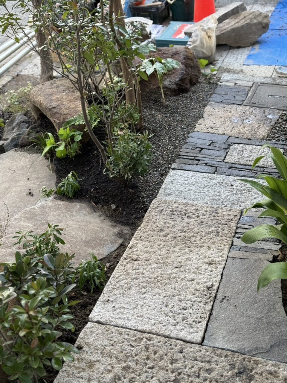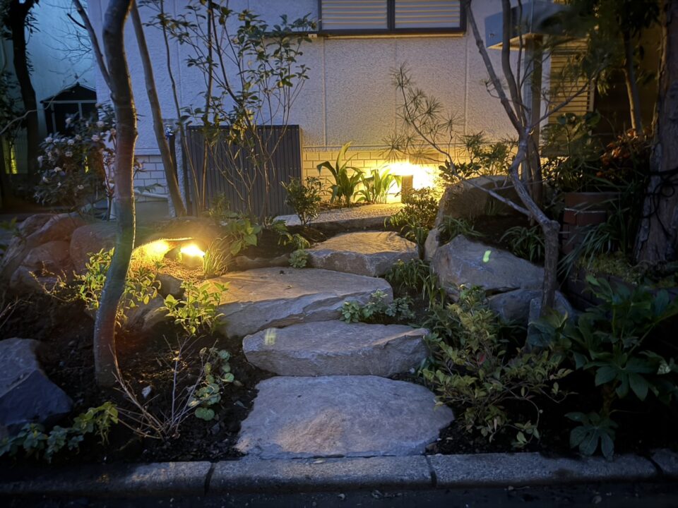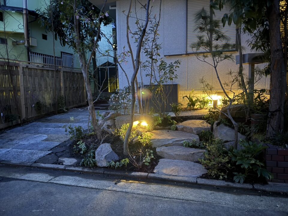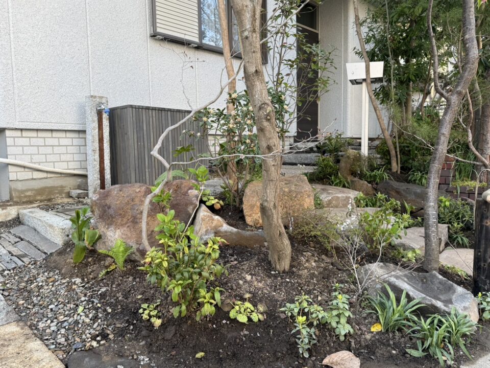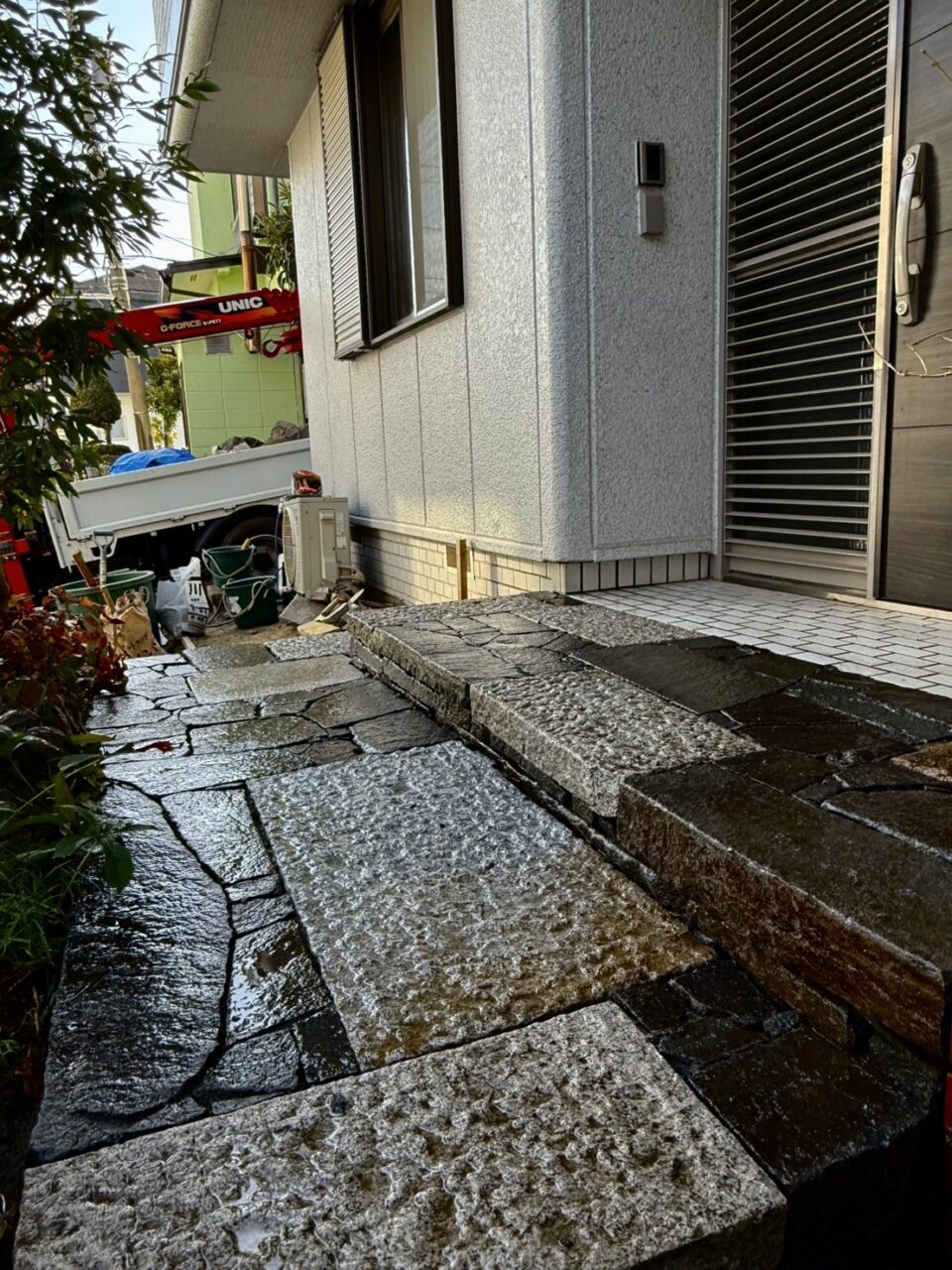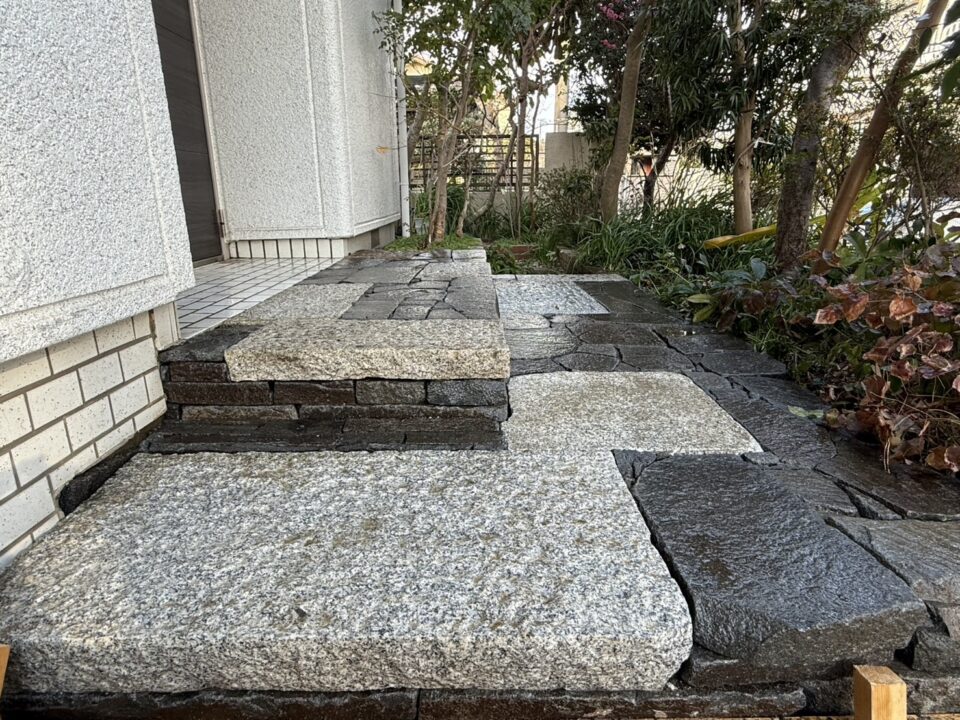 ホームページよりご依頼頂きました。白いタイルは滑るので雨の時危ないため、もっと自然な雰囲気にし自然石でのアプローチに変えたいとのご要望があり、弊社の施工事例を見て頂きご依頼頂くことになりました。