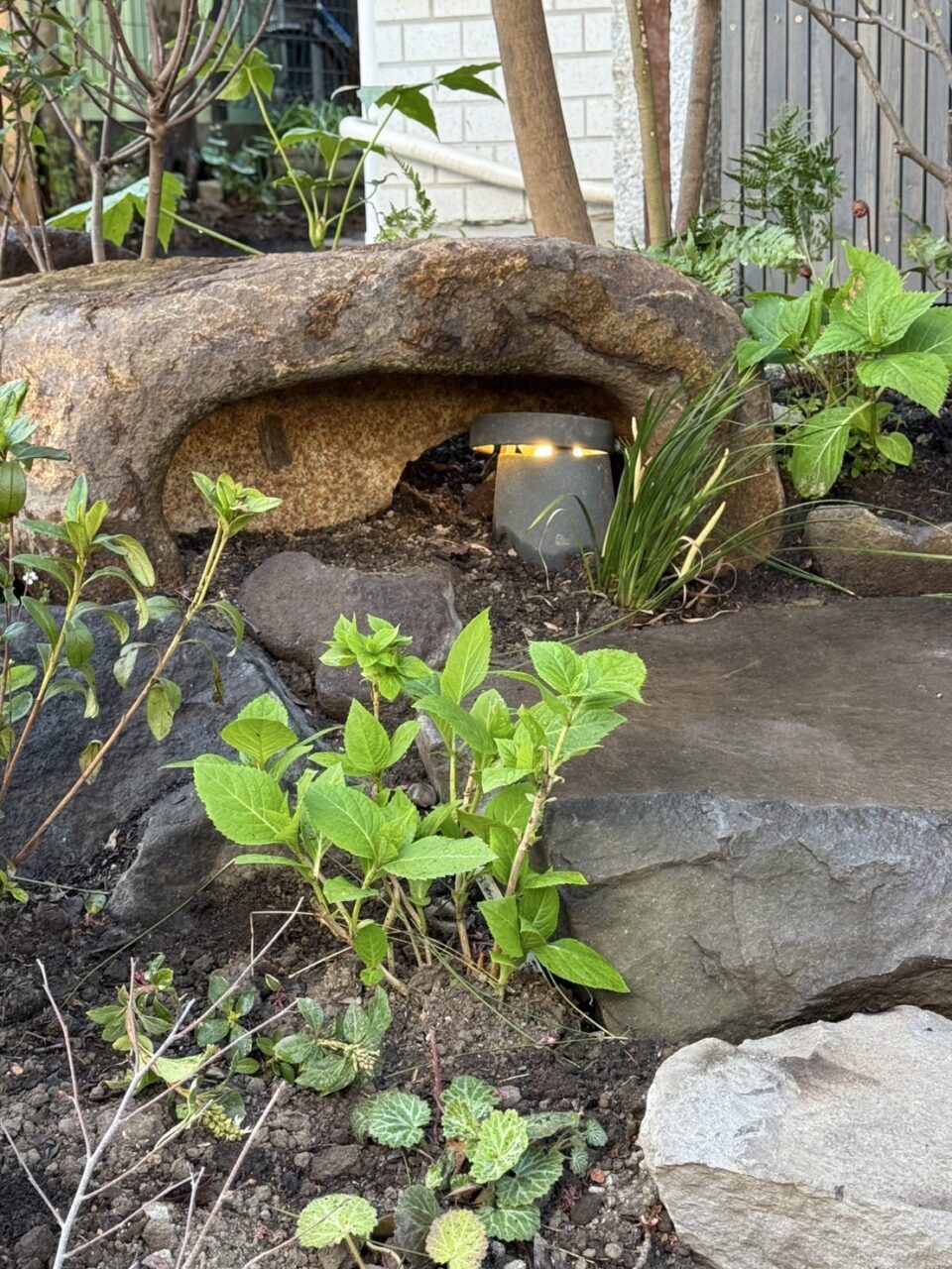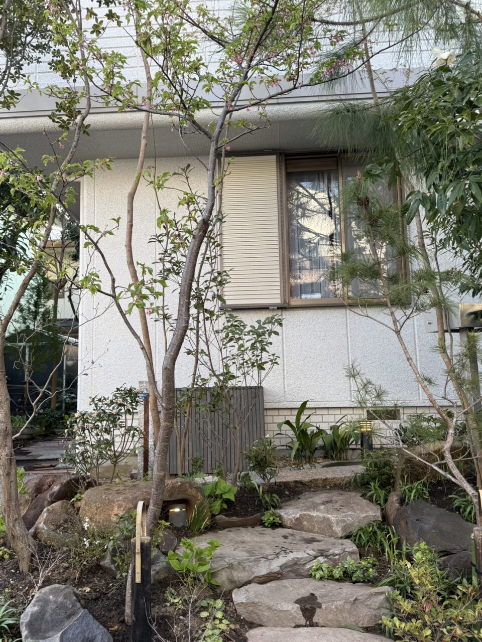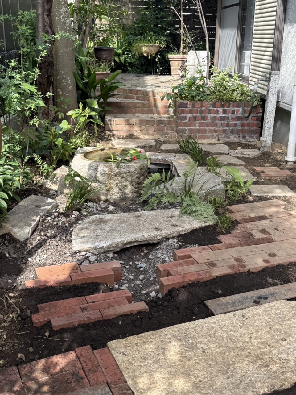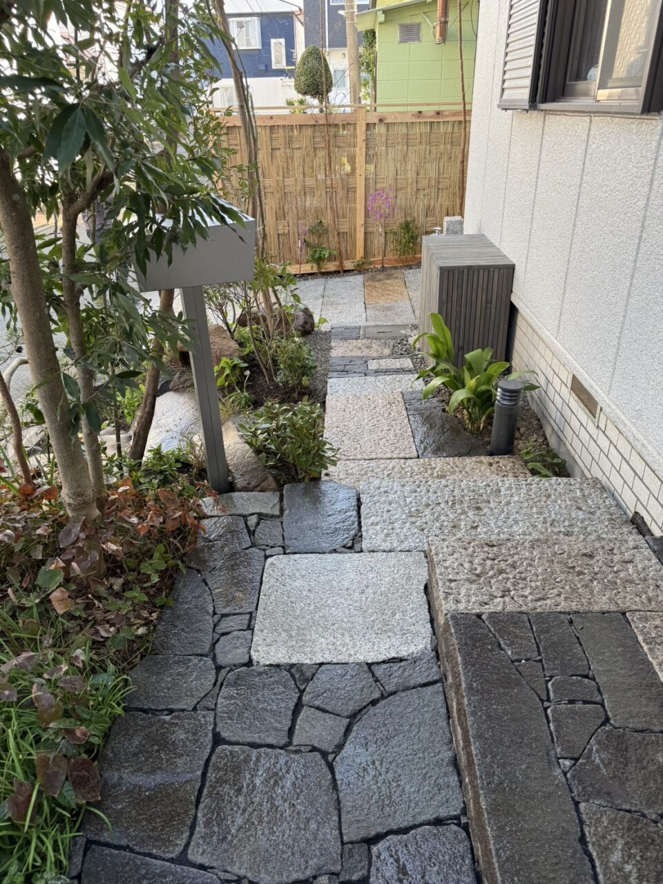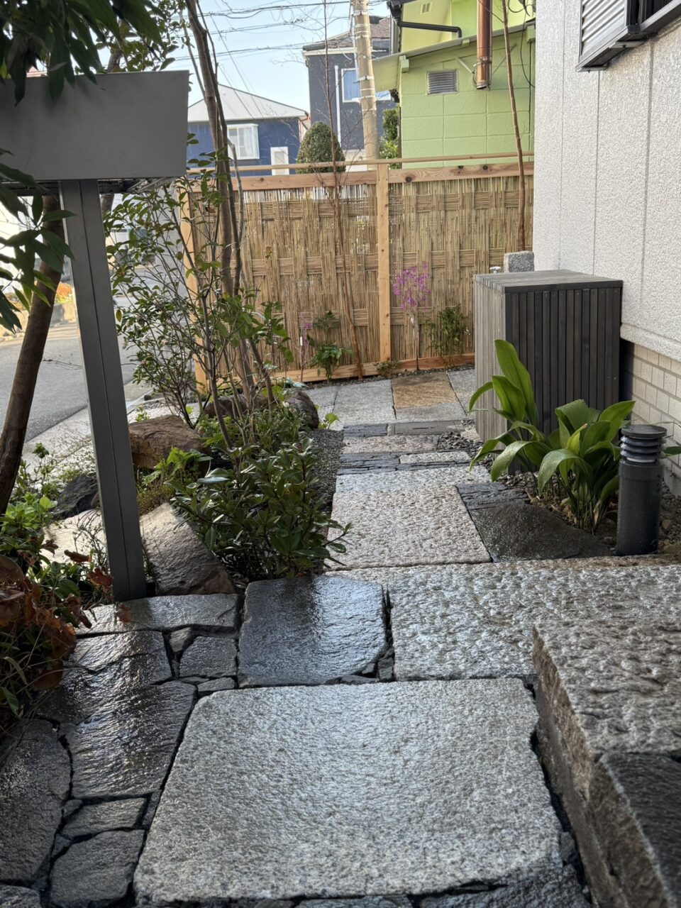 また室外機を隠すため室外機隠しをつくり、立水栓は御影の平板と鉄の板でつくりなおしました。