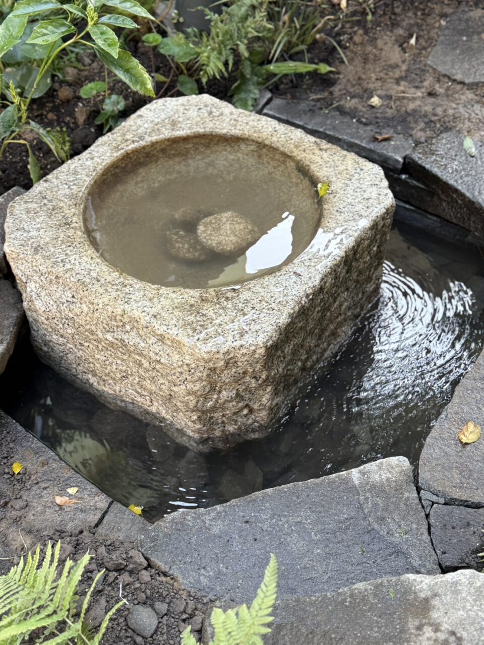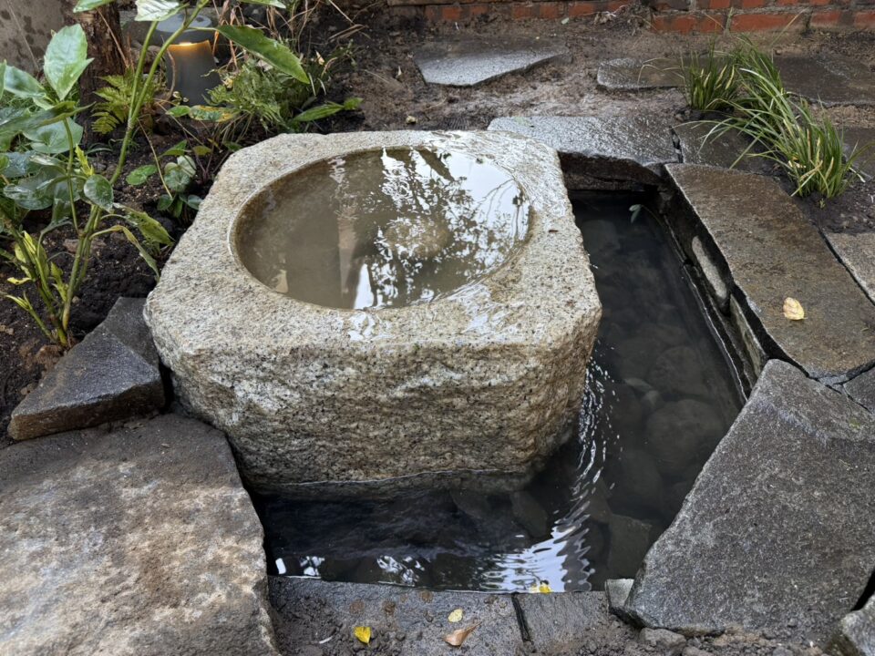 庭部分は鳥が休めるように水鉢を置き、循環させて楽しめるようにしました。