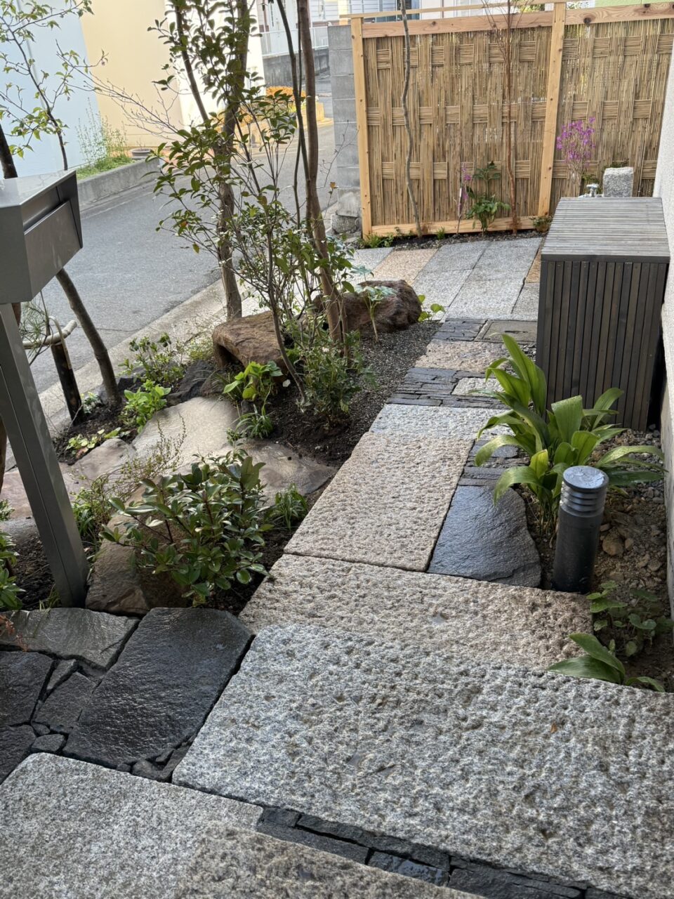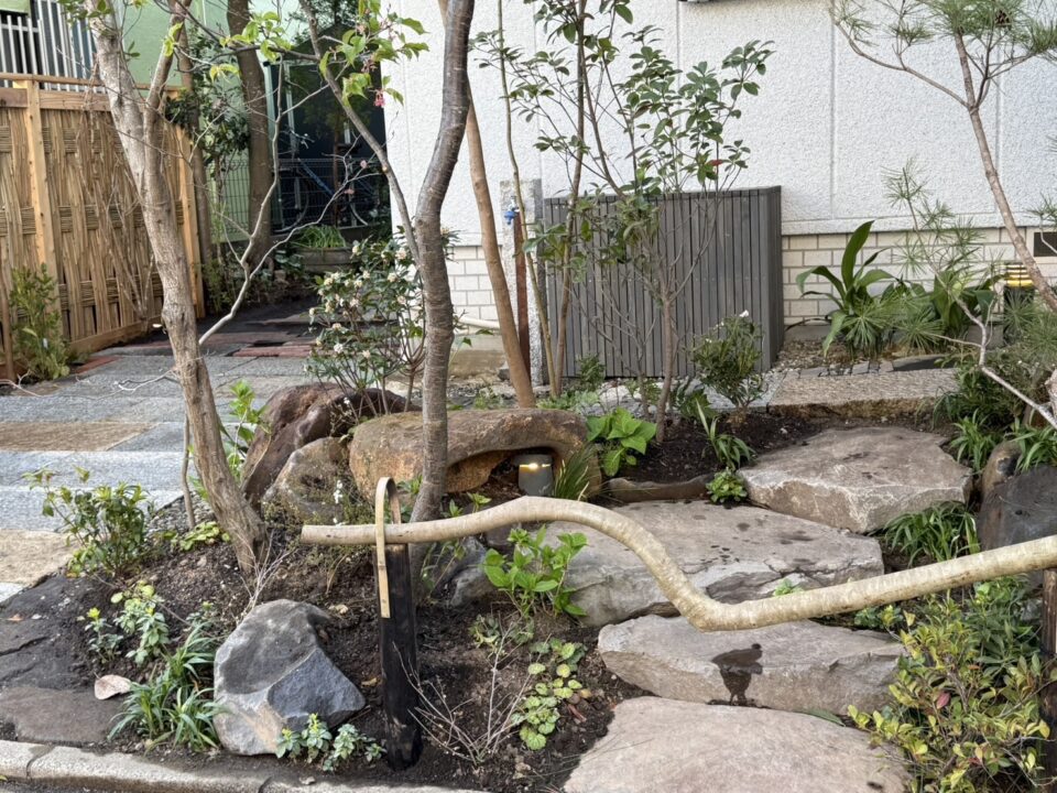 今回は、小松石の階段作成、諏訪鉄平石の天然木端石を使用し、階段を施した玄関アプローチ、諏訪鉄平石を敷き詰めた駐車場の造作、御影の平板と鉄の板で作った立水栓や、阿弥陀垣、水鉢設置など、こだわりのお庭リフォームにつき紹介させていただきます。