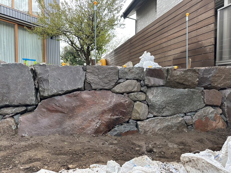 穴太積みを意識して積み上げた石積みは同じく古くからある版築との相性も良いかと思います。