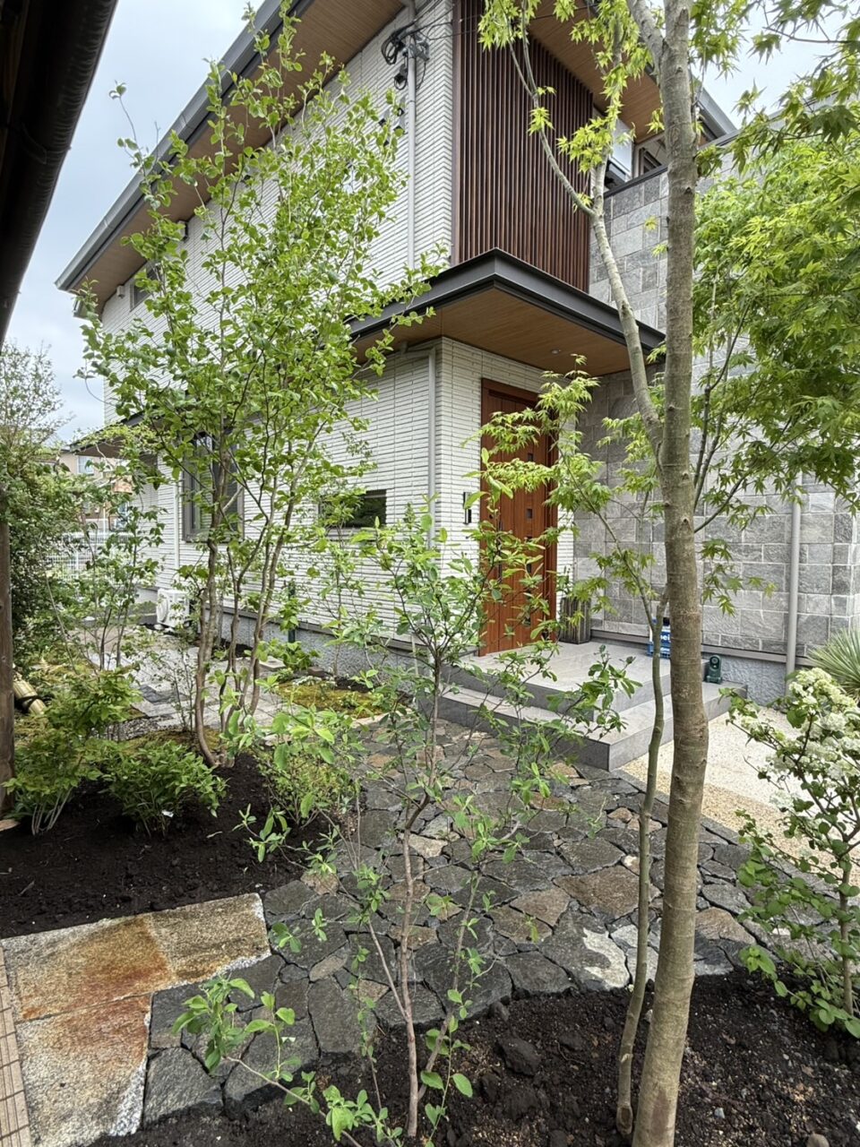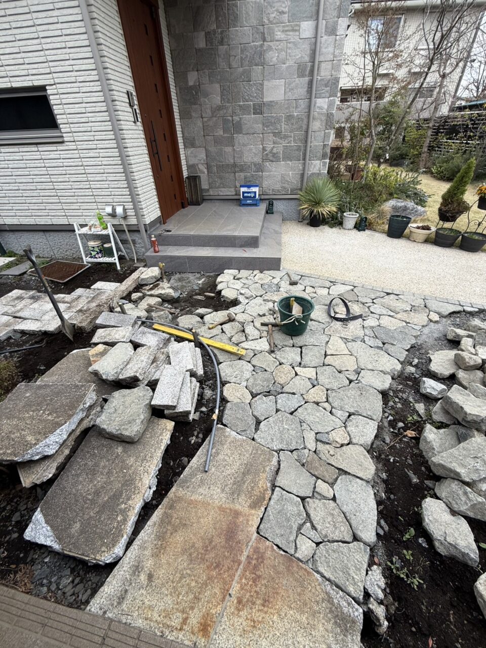 二世帯住宅にお住まいのお庭工事で、玄関までのアプローチを石で施工したいというお客様のご要望でした。敷石によるアプローチ施工は弊社の得意とする施工の一つです。