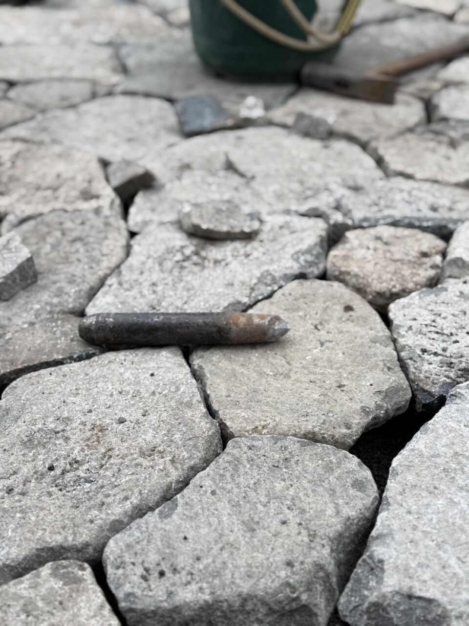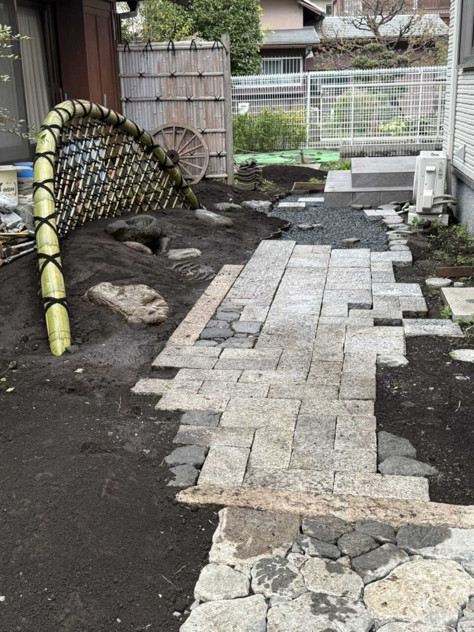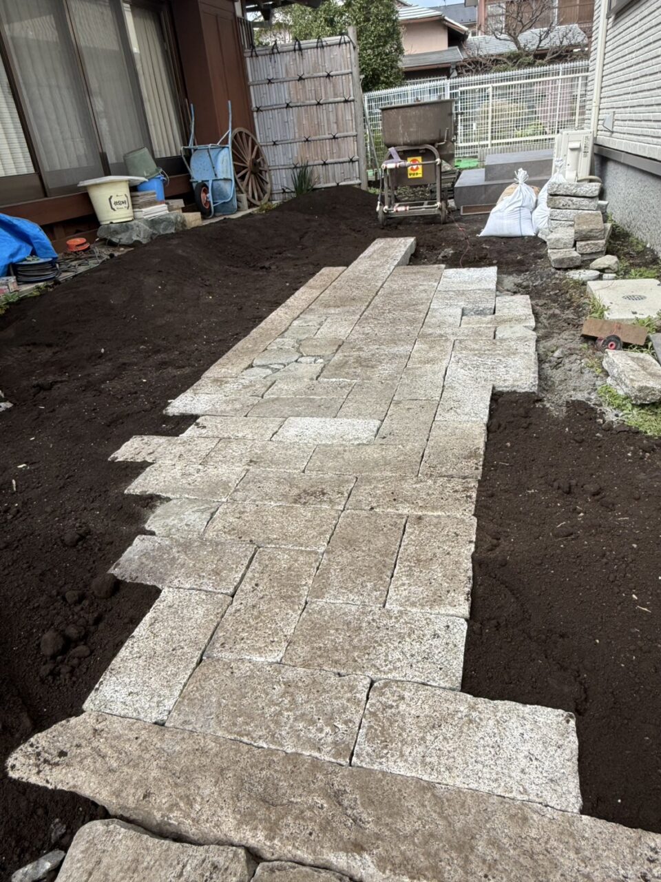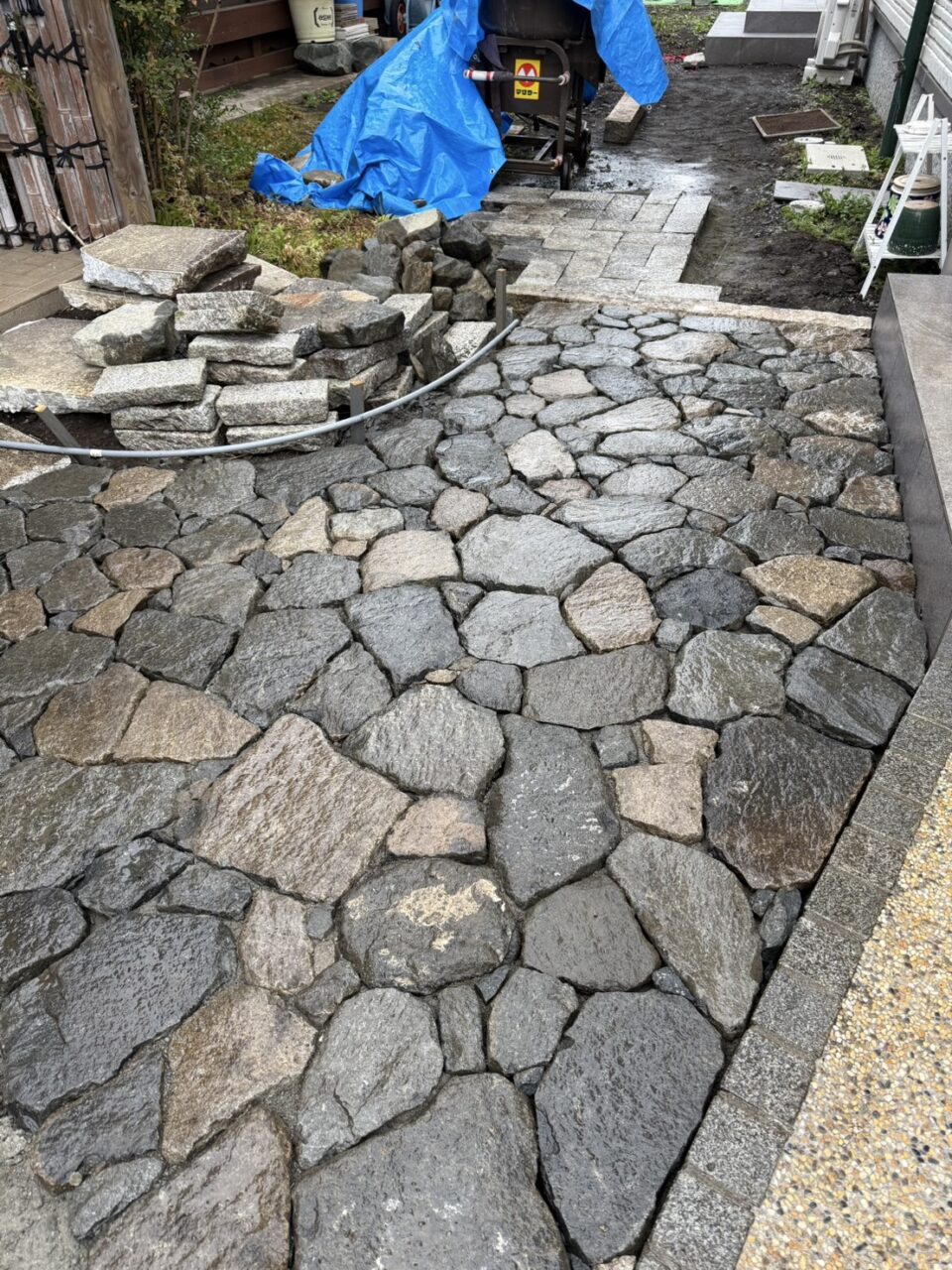 まずは石張りにて通路を作成しました。 同じ敷石では単調なので変化を付けて敷石と三和土(たたき)を混ぜて施工しました。