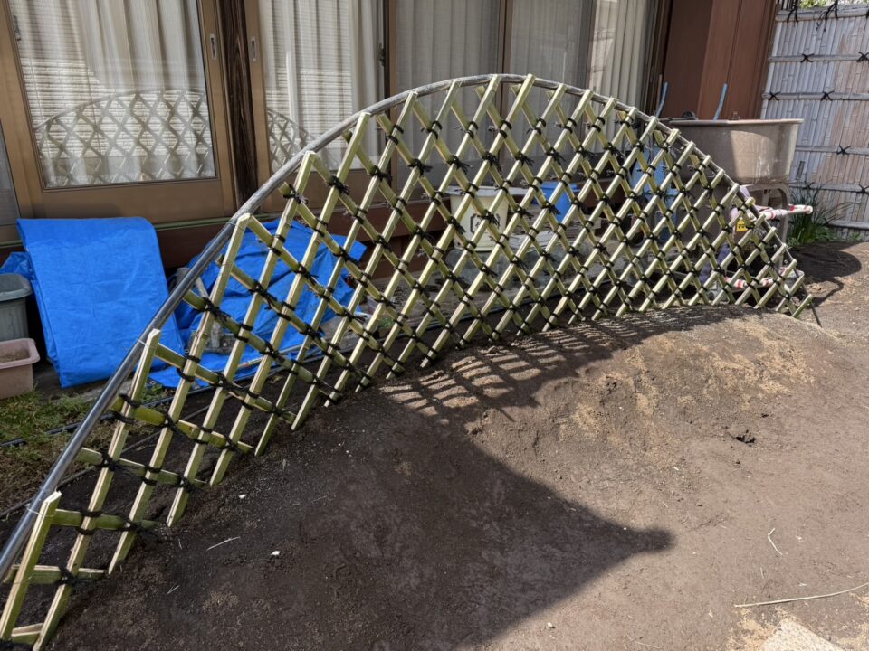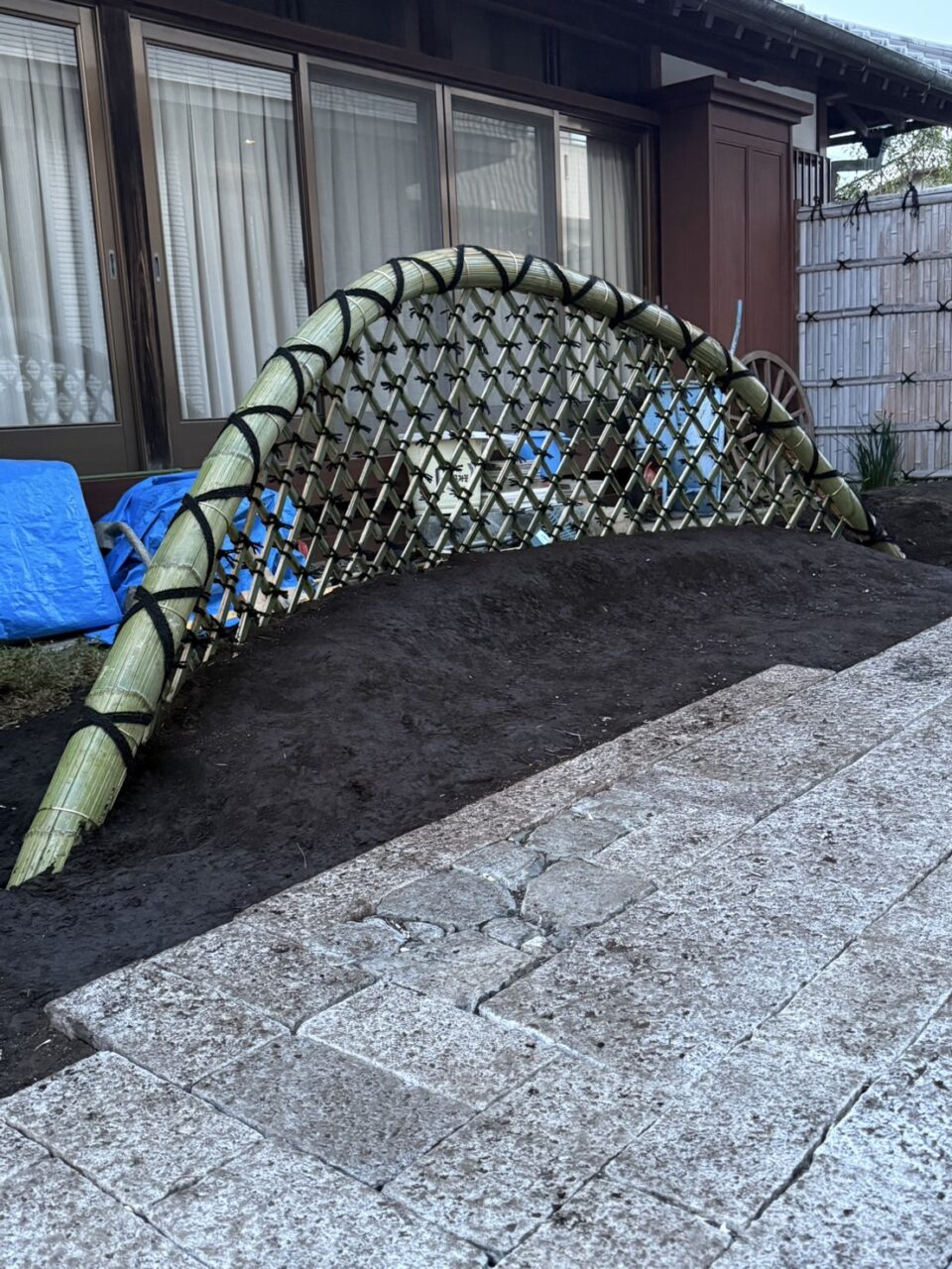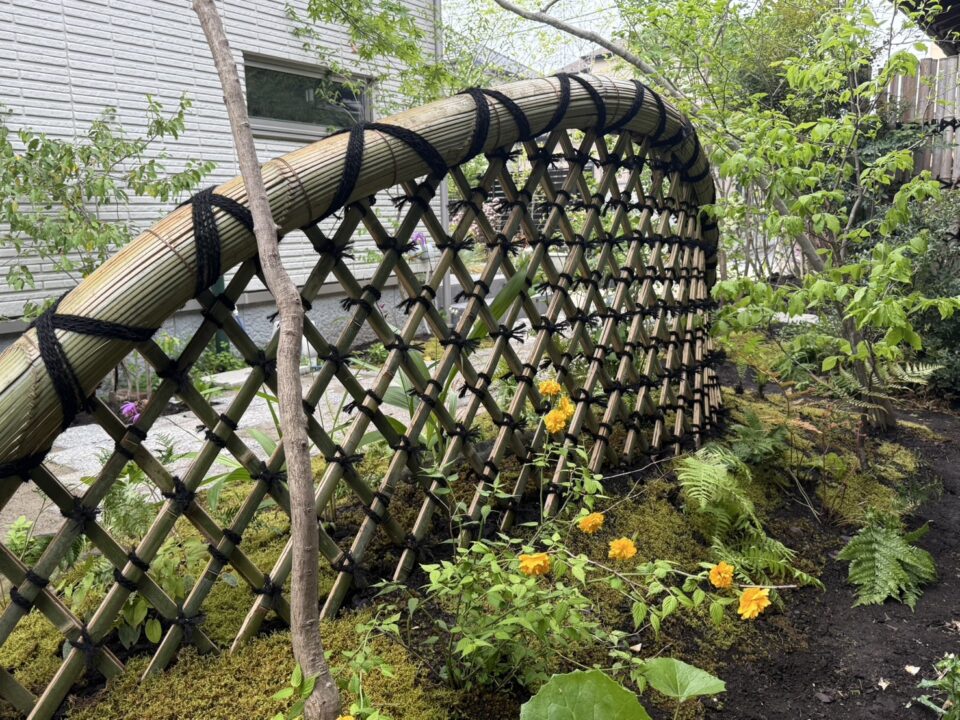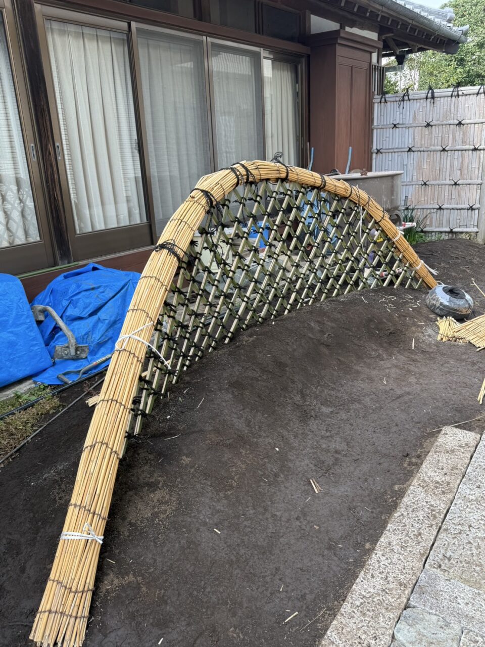 また両面で楽しめる九頭竜垣という竹垣をアプローチの途中に作りました。 尺竹を96割まで割いて鉄筋の入った塩ビパイプによしずをアンコにいれ、竹を巻きました。