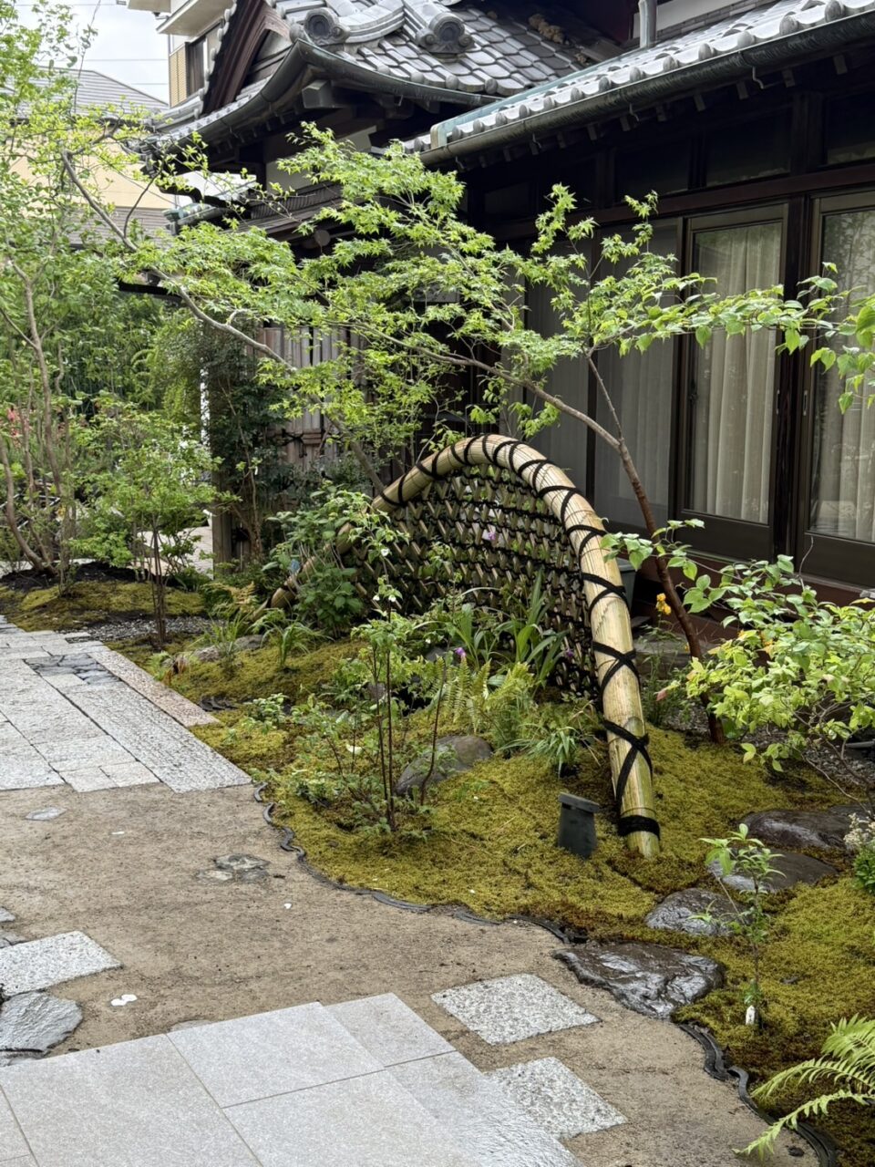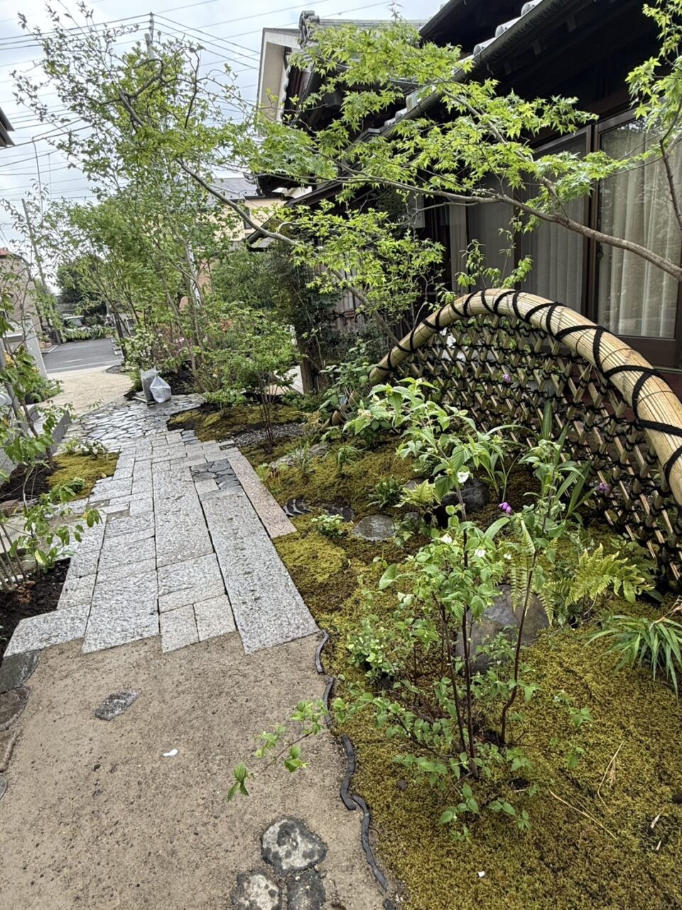 九頭竜垣という竹垣を敷石と三和土(たたき)によるアプローチに作成し、素敵に馴染む苔張りと植栽を施したお庭づくりを紹介させていただきます。