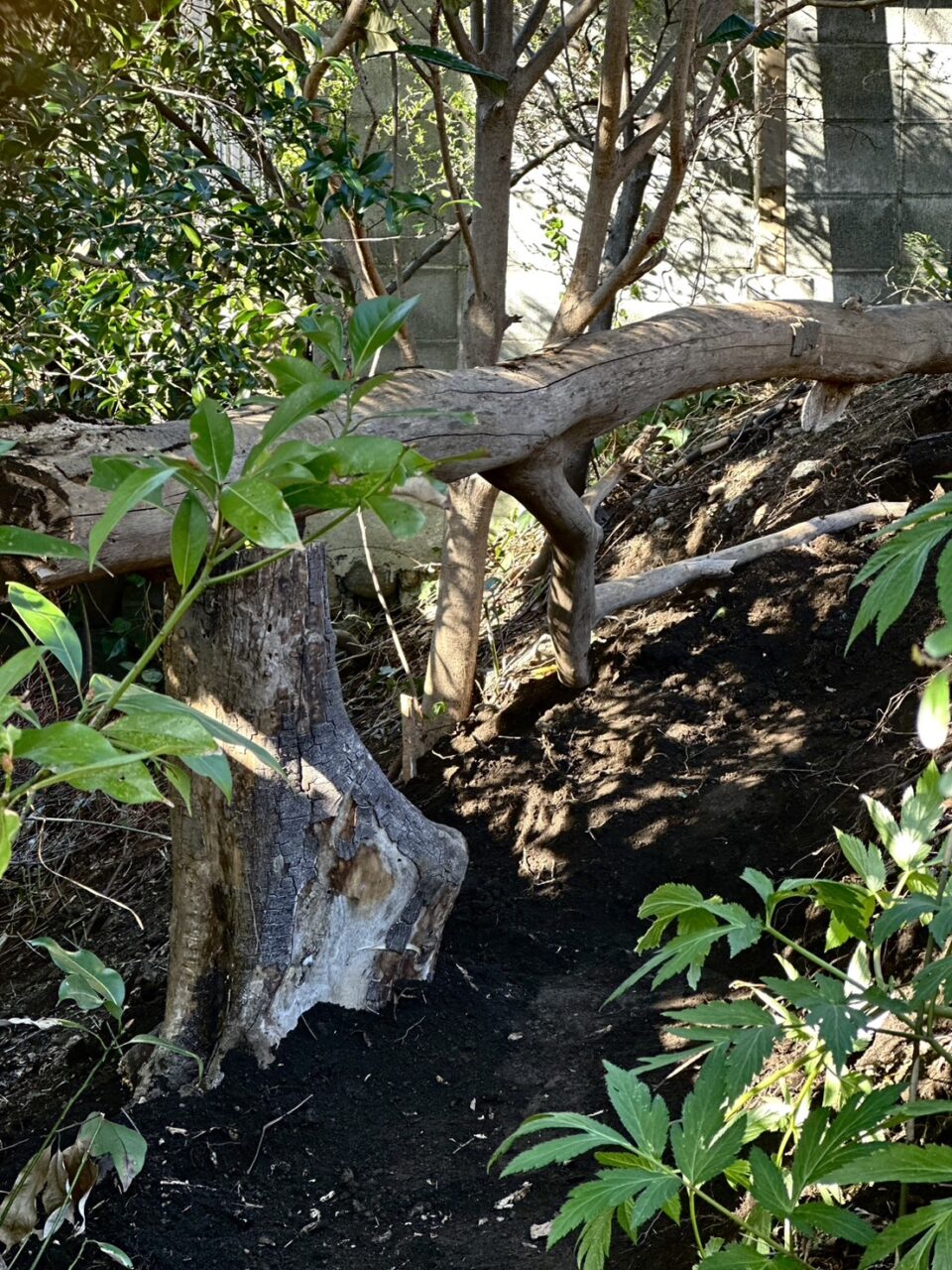 駐車場は元々斜面に植栽されていた木を移植し、車が最大3台停めれるように拡張工事しました。