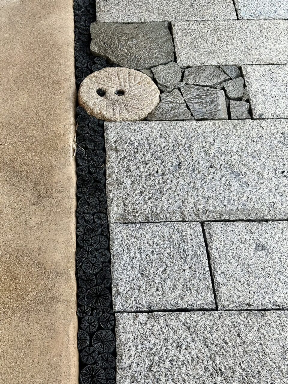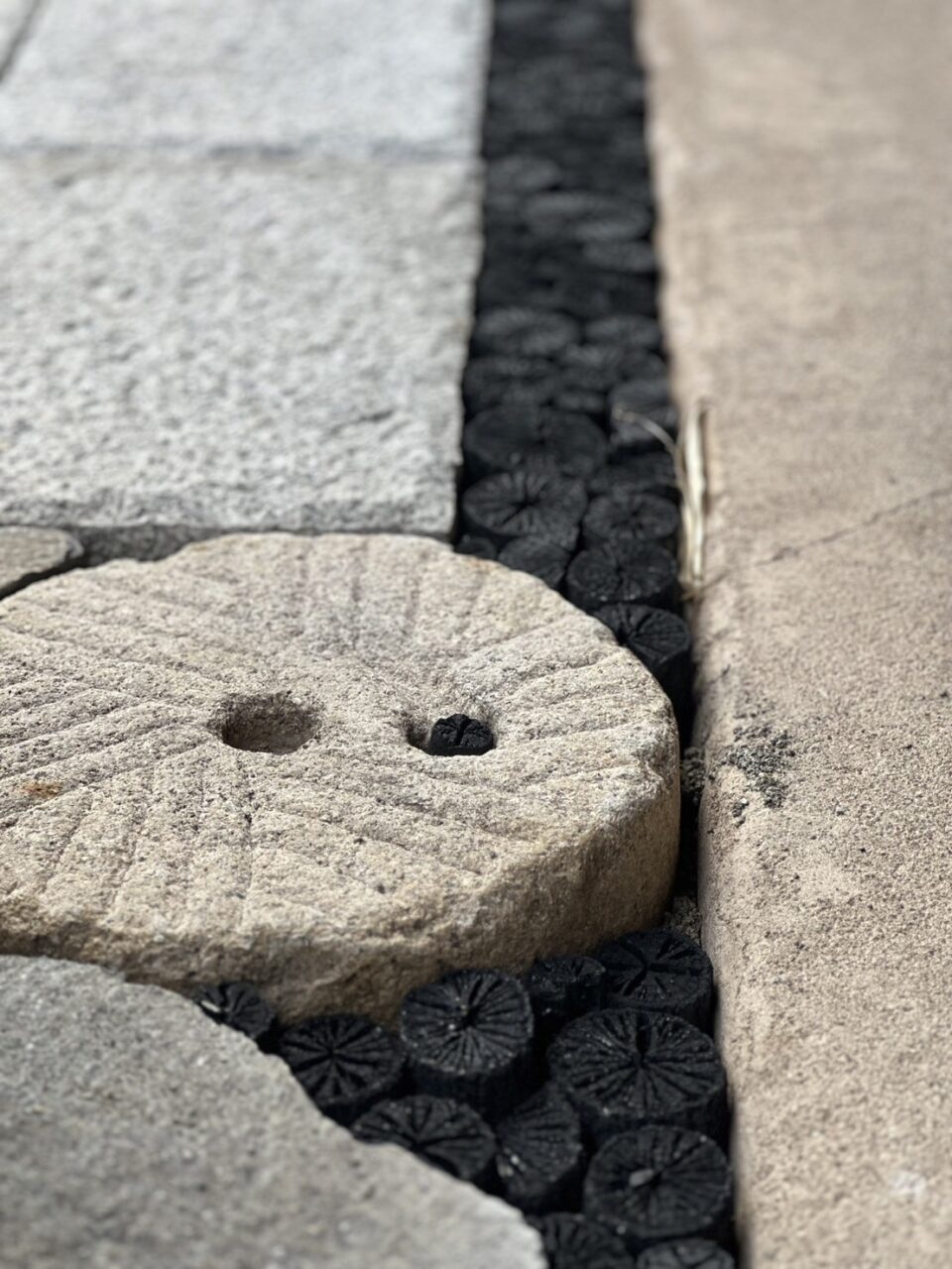 また建物と駐車場の間には排水路として菊炭を敷きました。