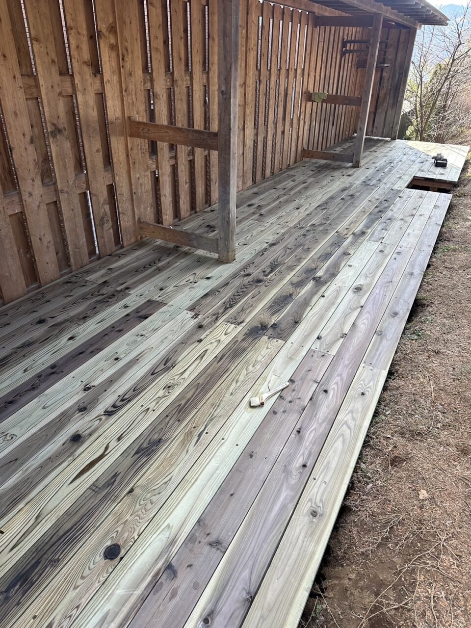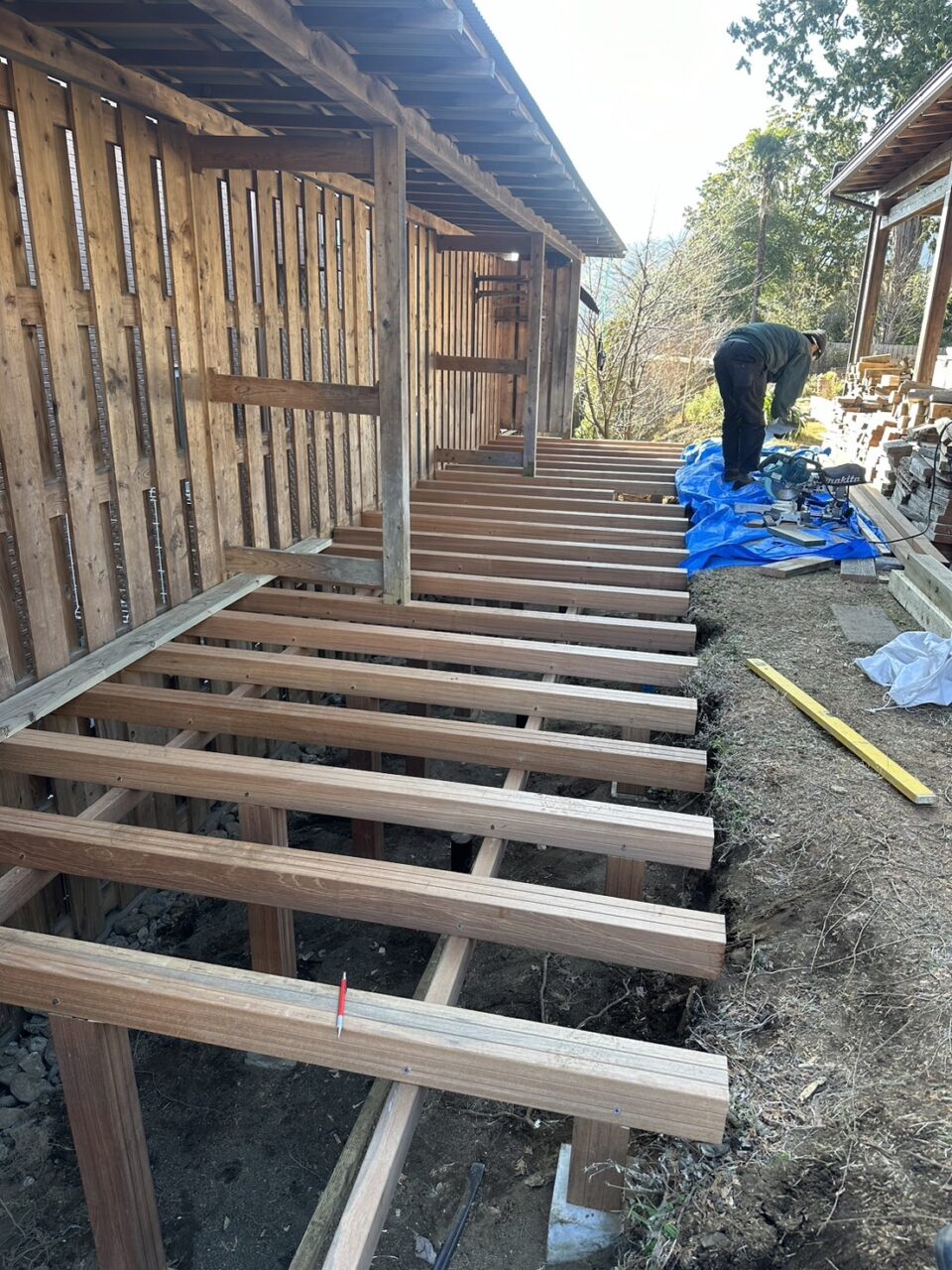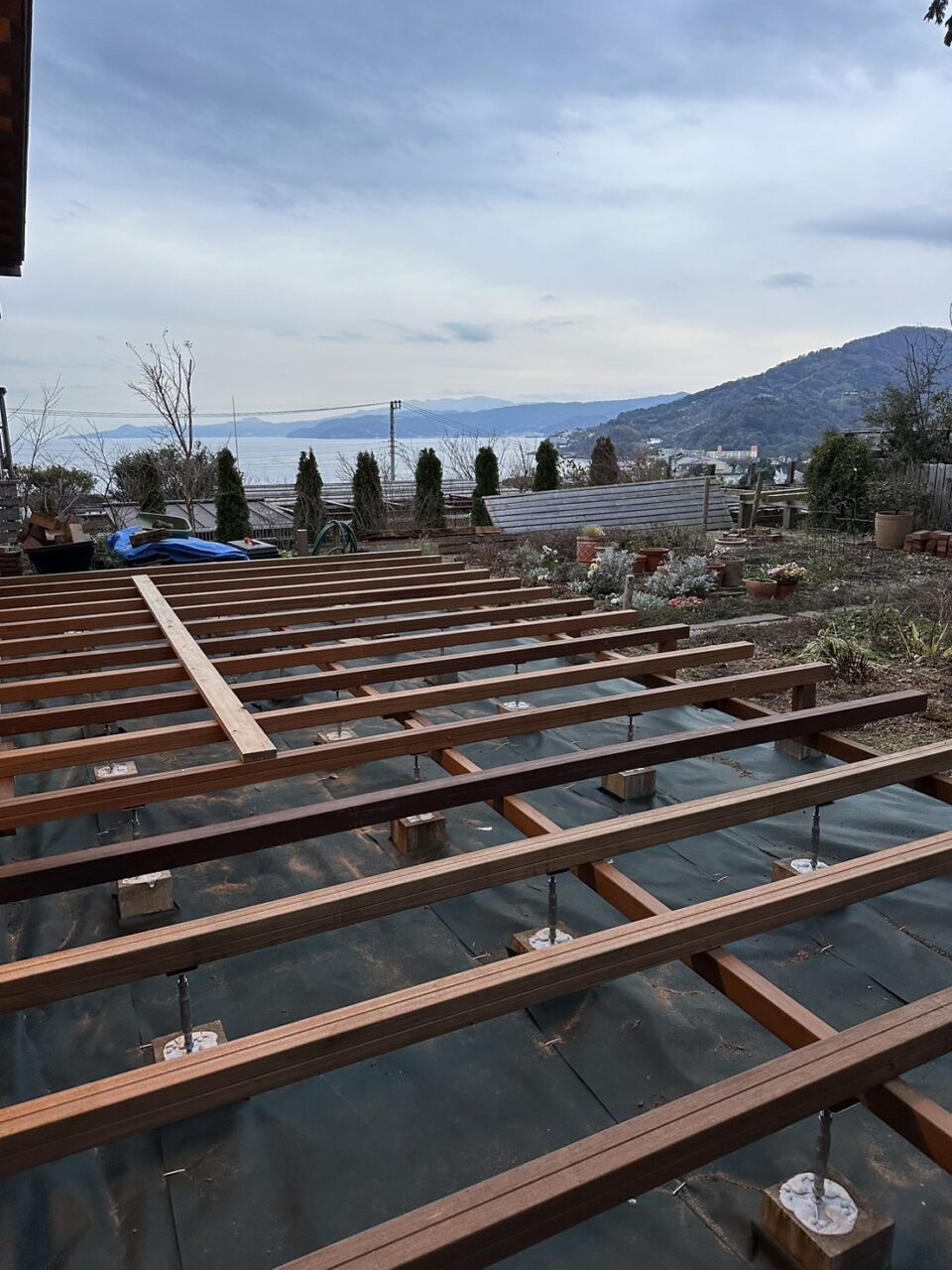 10年で柱が老朽化し、浮いた状態になったり、床材が腐って今にも底が抜けそうになっていたので、柱と根太材は腐りにくいハードウッドで作り替えました。