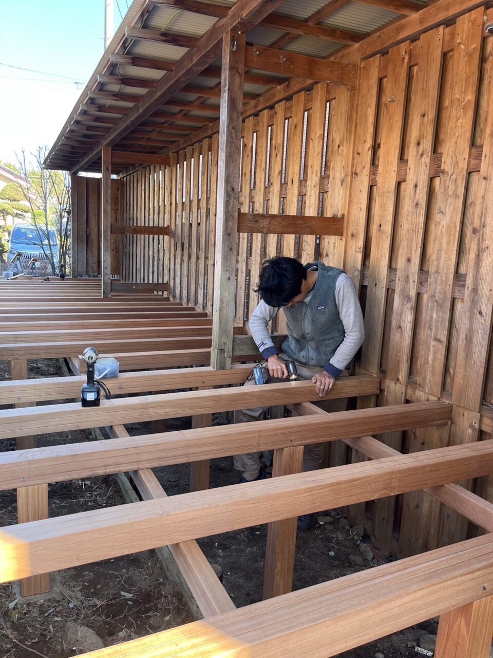 まずは10年前に施工されたウッドデッキや薪棚の柱や根太、床材を全部解体しました。